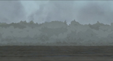 La mère de dos, déjà en état d’éveil dans les plans précédents et dans un plan moyen, est tournée vers la mer. Elle voit la première le tsunami arriver. Le grondement de la mer déchainée remplit le cadre et recouvre presque ses halètements de peur. Comme dans le plan précédant où le fils sort du cadre en privant la nature de présence humaine, celle-ci sortira dans la précipitation du cadre pour aller retrouver au prochain plan son compagnon, laissant place à une vague gigantesque qui arrive vers nous. Alors que l’homme ne semble pas relié aux éléments naturels et ne sent pas ce qui arrive, la femme tente de l’éloigner de la vague qui arrive. Les plans successifs de demi ensemble en plongée zénithale encore une fois, donne la sensation d’un regard omniscient, d’une puissance inhumaine observatrice. C’est avec l’arrivée de la vague que le son s’est transformé en insérant progressivement en fondu enchaîné tout au long des plans de la musique. La montée dramatique s’installe sans parole, sans cri, mais en musique et en couleurs symboliquement froides et grises.
