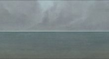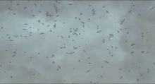 La mère de nouveau dans le même plan que le père, comme davantage reliée à la nature, nous indique ce qui il y a voir dans son raccord regard. Dans un plan en contre plongée, on peut à notre tour observer les oiseaux qui s’agitent et crient de plus belle dans le ciel. Mais cette fois le plan d’ensemble sur le ciel toujours très gris, extrêmement bruyant phoniquement et visuellement, se vide pour laisser place au silence. Dans un plan taille devenu presque silencieux, la mère observe le ciel puis se tourne de ¾ pour observer le hors champ en direction opposée du vol des oiseaux, eux sortis hors champ à droite. Elle lâche un gémissement de peur en regardant ce qui arrive de derrière elle. Le cadre, cette fois-ci partagé par moitié entre ciel et mer, laisse deviner une ligne d’horizon luisante de clarté, comme une percée de lumière.