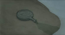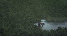 Le fils parti à l’intérieur de l’île, dans un plan de ½ ensemble en plongée, remplit sa bouteille d’eau. Le son d’ambiance des animaux de la forêt, grillons, grenouilles… que l’on imaginerait entendre au bord d’un étang, remplit le plan de sa présence. Quand le son de la faune s’arrête brusquement, le fils prend conscience que quelque chose ne va pas. Il fait alors marche arrière, subitement vers la gauche, pour rejoindre ses parents en lâchant sa bouteille. Dans un gros plan permettant d’entendre le son de la scène, abandonnée sur le bord de l’étang, elle se videra bruyamment de son eau comme si elle venait d’échouer à nouveau.