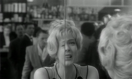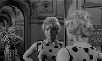 Donc malgré tout cela, avant de sortir de l'immeuble, Cléo est de nouveau soucieuse de son apparence en se regardant dans le miroir, acte déjà accompli dans l'appartement de la cartomancienne. Il est intéressant de noter que A. Varda avant de zoomer sur le visage de Cléo qui se sourit à elle-même place son actrice de sorte à ce que son image soit démultipliée par le miroir. (cf autres extraits de films dans lesquels même procédé utilisé).