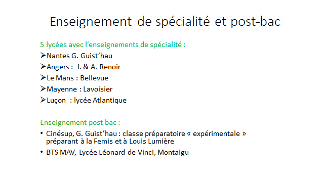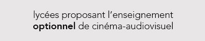 Au lycée, on peut suivre l’enseignement de cinéma-audiovisuel selon deux dispositifs différents : l’enseignement de spécialité, quatre heures par semaine en classe de première, six heures en terminale et l’enseignement optionnel, accessible à toute filière générale ou technologique, trois heures par semaine dès la seconde, les deux étant éventuellement compatibles. Les deux enseignements sont évalués en contrôle continu mais dans la réforme du baccalauréat, seul celui de spécialité donne lieu à des épreuves finales, écrite et orales.