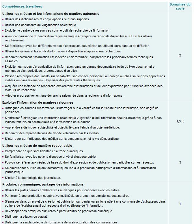 Avec une expertise dans le champ des sciences de l'information et de la communication, les professeurs documentalistes "contribue(nt) aux enseignements et dispositifs permettant l'acquisition d'une culture et d'une maîtrise de l'information par tous les élèves."