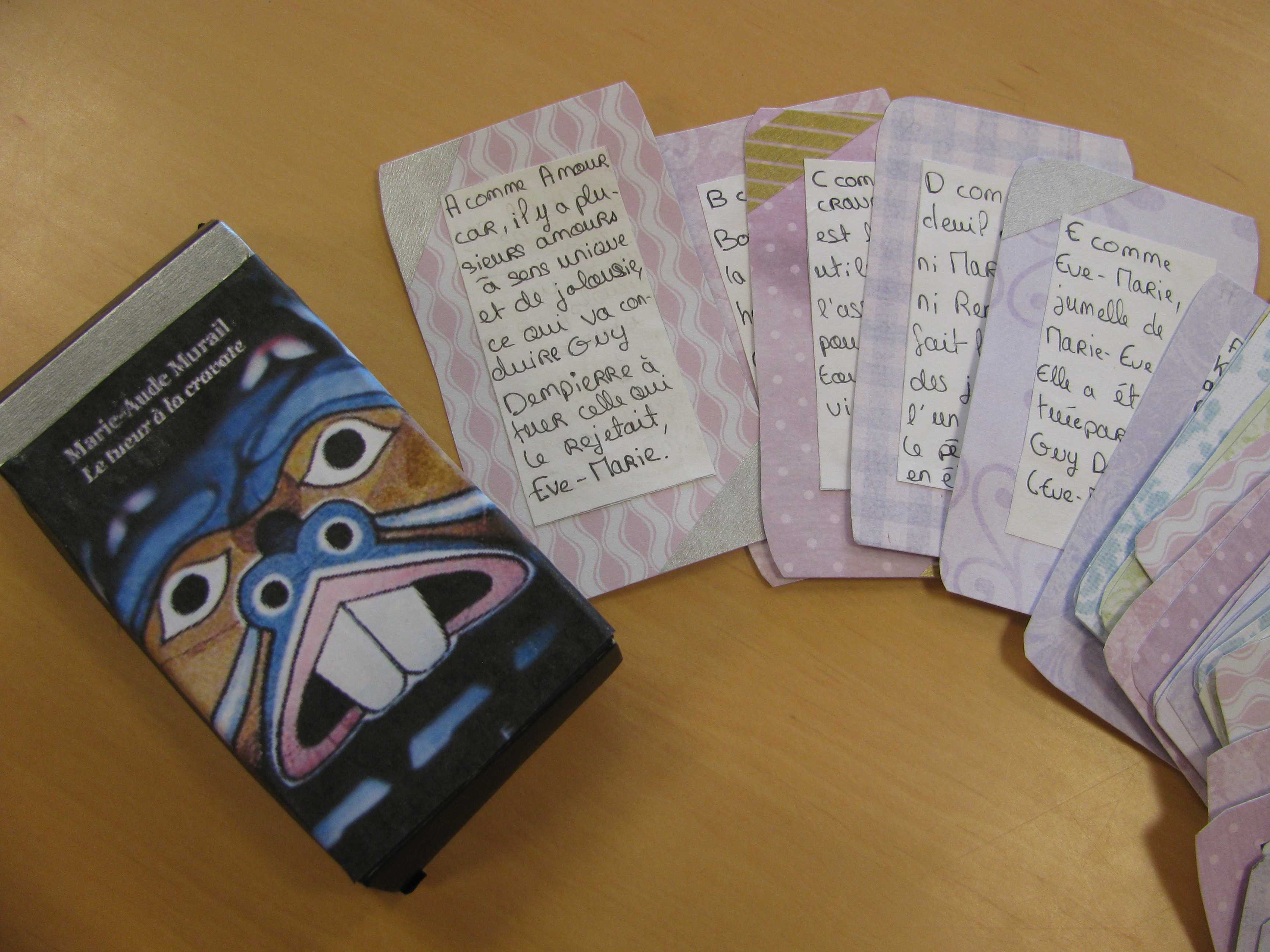 Après avoir lu le roman intitulé le Tueur à la cravate les élèves ont préparé un jeu de cartes où chaque carte représente une lettre de l’alphabet et développe un thème ou un personnage du livre autour de cette lettre.