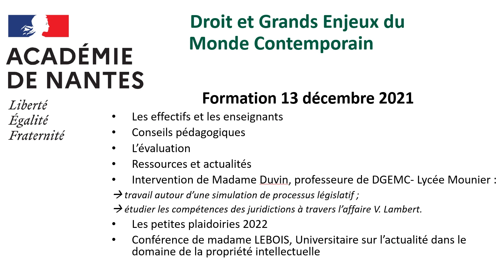 Madame Duvin, professeure de DGEMC au Lycée Mounier est intervenue sur les thèmes suivants :