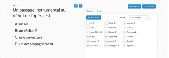 Chaque élève a une carte avec un code qui lui est assigné sur laquelle 4 réponses sont possibles. Les questions sont projetées au vidéoprojecteur en direct et le professeur ou un élève scanne les cartes. Les réponses peuvent être affichées.