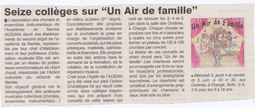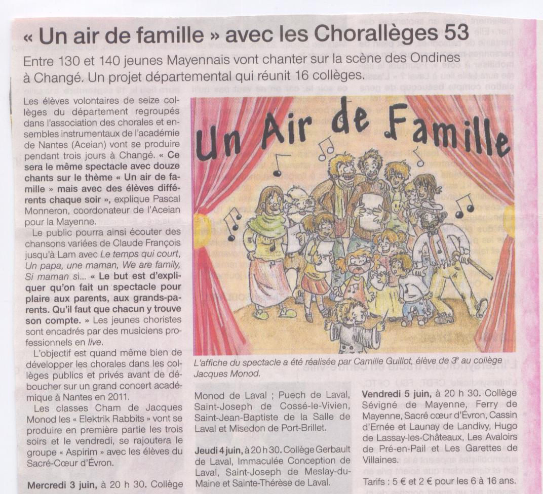 Près de 400 élèves issus de 16 collèges mayennais ont chanté ce programme intitulé "Un air de Famille". Cette famille, nos élèves, vos enfants, vous l'ont chantée composée, décomposée, recomposée...Elle a eu peut-être une résonance, voire un air de famille avec certaine de vos connaissances. Bravo pour le travail des choristes poursuivi semaine après semaine, tout au long de l'année scolaire qui s'est exprimé lors de ces concerts.