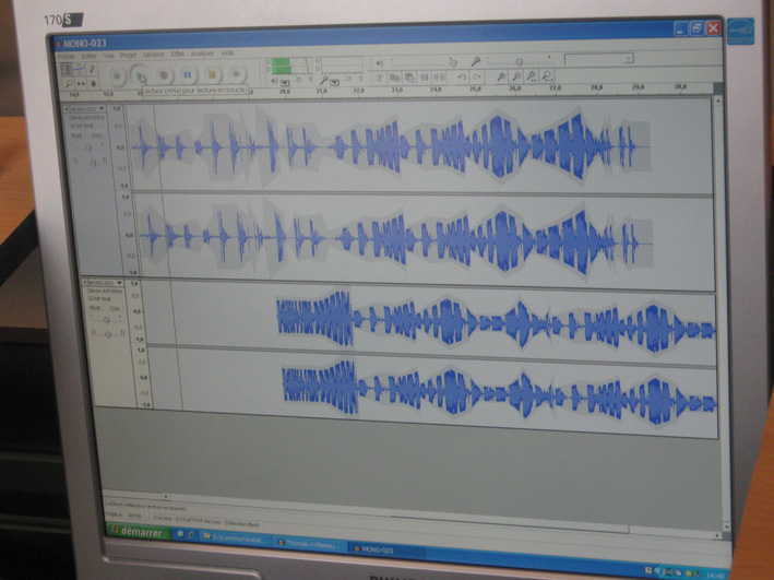 La classe a ensuite été divisée en deux. Un premier groupe est allé en salle multimédia pour travailler sur Audacity. Les élèves devaient piocher dans la banque sonore qu'ils avaient créée afin de réaliser un son d'environ une minute avec un caractère de peur ou d'angoisse. Tous les sons des élèves seront par la suite rassemblés pour donner une bande sonore qui servira de base à l'installation sonore.
