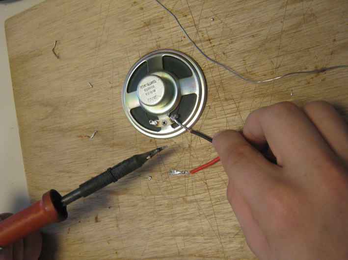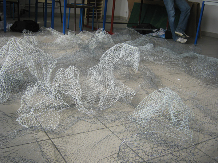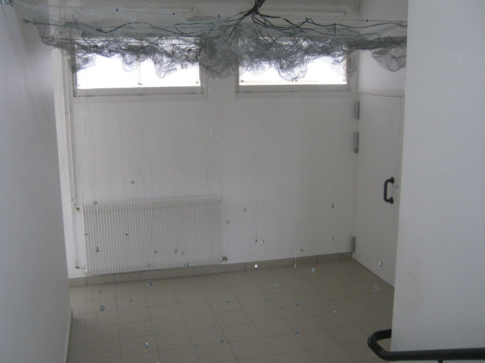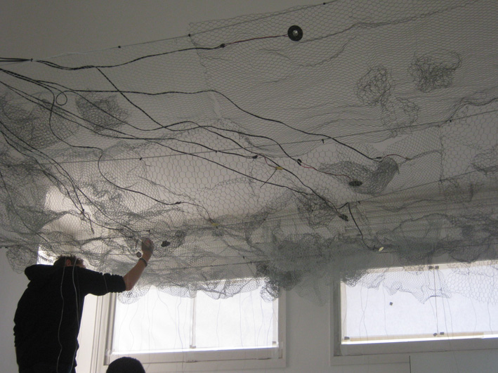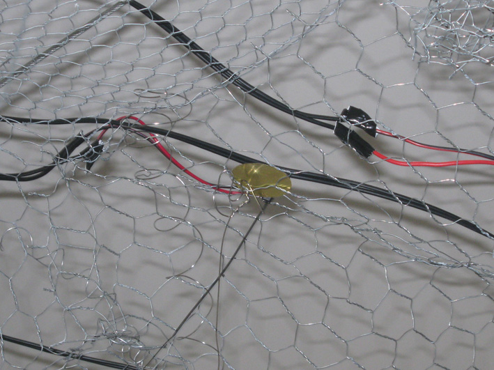 A cette structure ont été tendus des câbles lestés par des boulons. Des petites enceintes y ont été placées pour diffuser les sons réalisés par les élèves en salle multimédia. A la base de certains câbles ont été placés des micro piezo qui vont créer des grincements quand les visiteurs toucheront les câbles.
