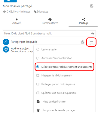 Cliquer sur les [...] en face de Partager par lien public pour sélectionner "Dépôt de fichiers"