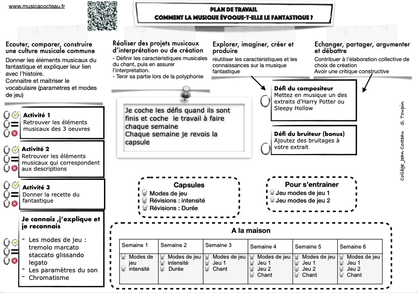 Une première étape avant le plan de travail peut être la feuille de route : de manière numérique ou papier elle indique aux élèves les activités à effectuer lors de la séquence dans un ordre établi par le professeur. Les élèves ou groupes ont la possibilité de l’effectuer à leur rythme.