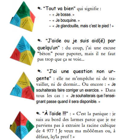 Les élèves sont amenés à réaliser une tâche "seul et sans aide". Personne ne doit aider, ni l'enseignant, ni les camarades. Il est donc important que l'enseignant pense au maximum son document pour que l'élève puisse être suffisamment autonome.