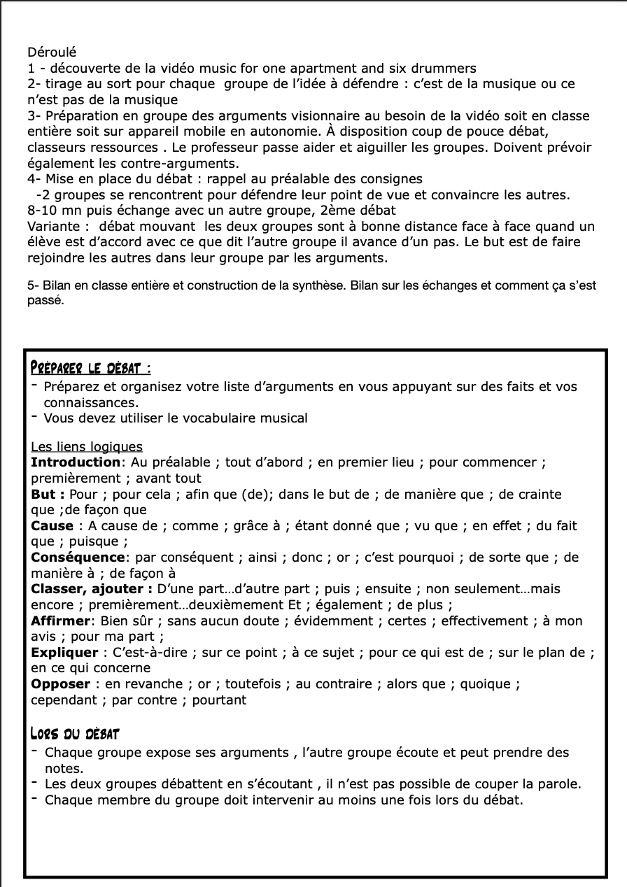 Dans cette séquence, vous trouverez l’écoute de 3 oeuvres, un temps de débat autour d’une des oeuvres , un projet musical ainsi que deux propositions de création au choix . Pour cette séquence plusieurs documents sont à disposition: les fiches élève, le déroulé de séquence, l’accompagnement pour le débat, des grilles d’évaluation débat et création ainsi que les extraits des oeuvres.