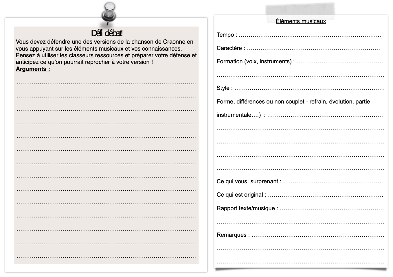 Ce jeu de rôle est très intéressant puisqu’il invite à l’échange, au débat et à l’argumentation. De cette manière, chacun peut construire son propre point de vue au fur et à mesure des débats. Nous pouvons imaginer plusieurs questions de départ pour lancer ce jeu de rôle : - Le compositeur a-t-il répondu à l'objectif donné ? - Le compositeur a-t-il réussi à transmettre l'émotion souhaitée ? - La musique est-elle en rapport avec le texte ? - La parodie et la citation témoignent-elles du manque d'imagination du compositeur ? - Le compositeur fait-il de la musique ? etc.