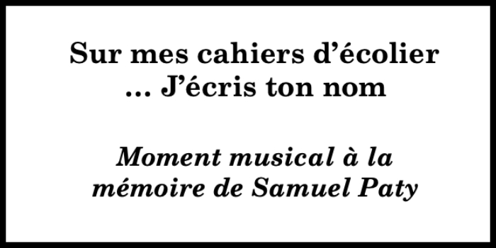 En octobre 2021, un hommage à Samuel Paty a été rendu grâce à un moment musical produit par des élèves de l'académie. Il apparaissait nécessaire de créer un évènement musical fédérateur concrétisant le principe de laïcité dans l’École de la République. Vous pouvez d'ailleurs toujours voir cet hommage en vous rendant sur cette page.