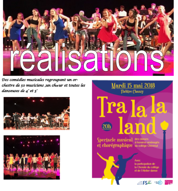 Les classes CHAM et CHAD se réunissent en plusieurs formations : un orchestre, un chœur et des danseurs. Ils se produisent plusieurs fois dans l’année lors d’évènements locaux, de commémorations diverses, de spectacles communs avec d’autres ensembles musicaux (orchestre de lycée , orchestre universitaire, orchestre étranger… etc. ) de collaboration avec des écoles mais aussi seuls pour des spectacles annuels autour d’un thème fédérateur.