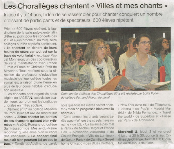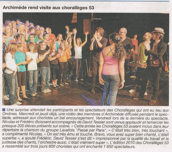 L'édition 2010 des chorallèges 53 a été un véritable succès. La radio France Bleu Mayenne proposait par l'intermédiaire de son émission "La mayenne dans tous les sens"et de son animateur Eric Vallé, une présentation de la manifestation. Nous trouvions aussi un article dans le journal Ouest France à la fin du mois de mai. Le spectacle intitulé cette année "Villes et Mes Chants" proposait une échappée au long cours autour de quelques villes du monde. Les chants interprétés par près de 600 choristes ont enchanté un public venu en très grand nombre cette année. Une surprise était réservée aux élèves sous la forme d'un petit message adressé par le groupe Archimède et de leur présence lors de la dernière de spectacle.