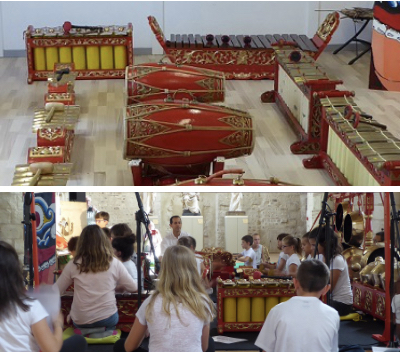 Depuis la rentrée 2014, cet instrument est pratiqué au collège Jacques Prévert. Les élèves écrivent des histoires et les racontent en les accompagnant des résonances de notre instrument-orchestre. Après avoir bénéficié du prêt de l'instrument de l'ambassade d'Indonésie pendant deux ans (2015-2017), l'établissement a reçu un gamelan neuf de la part du ministère de l'éducation et de la culture indonésien à la fin de l'année 2016.