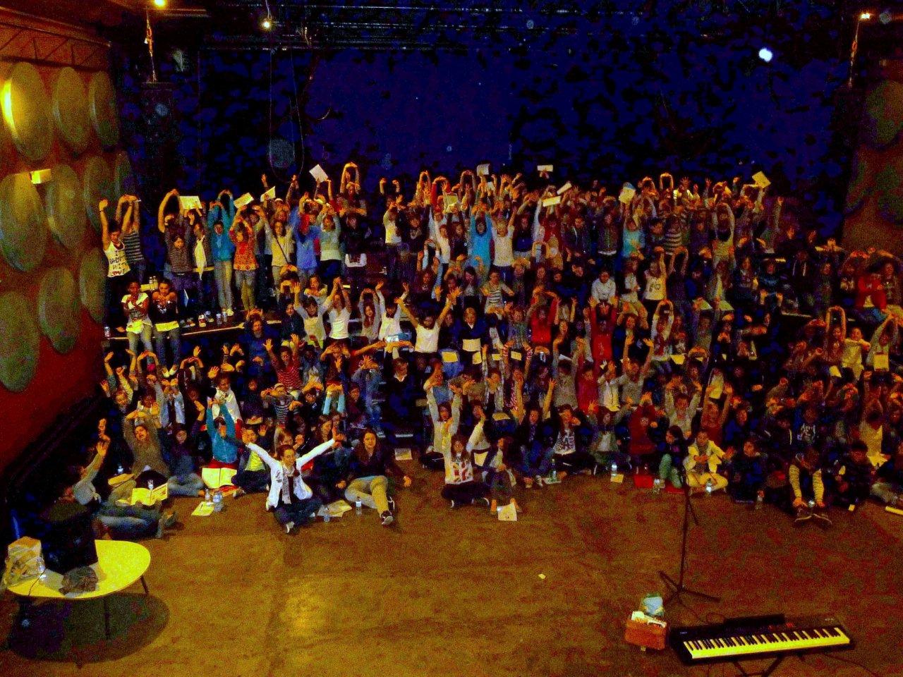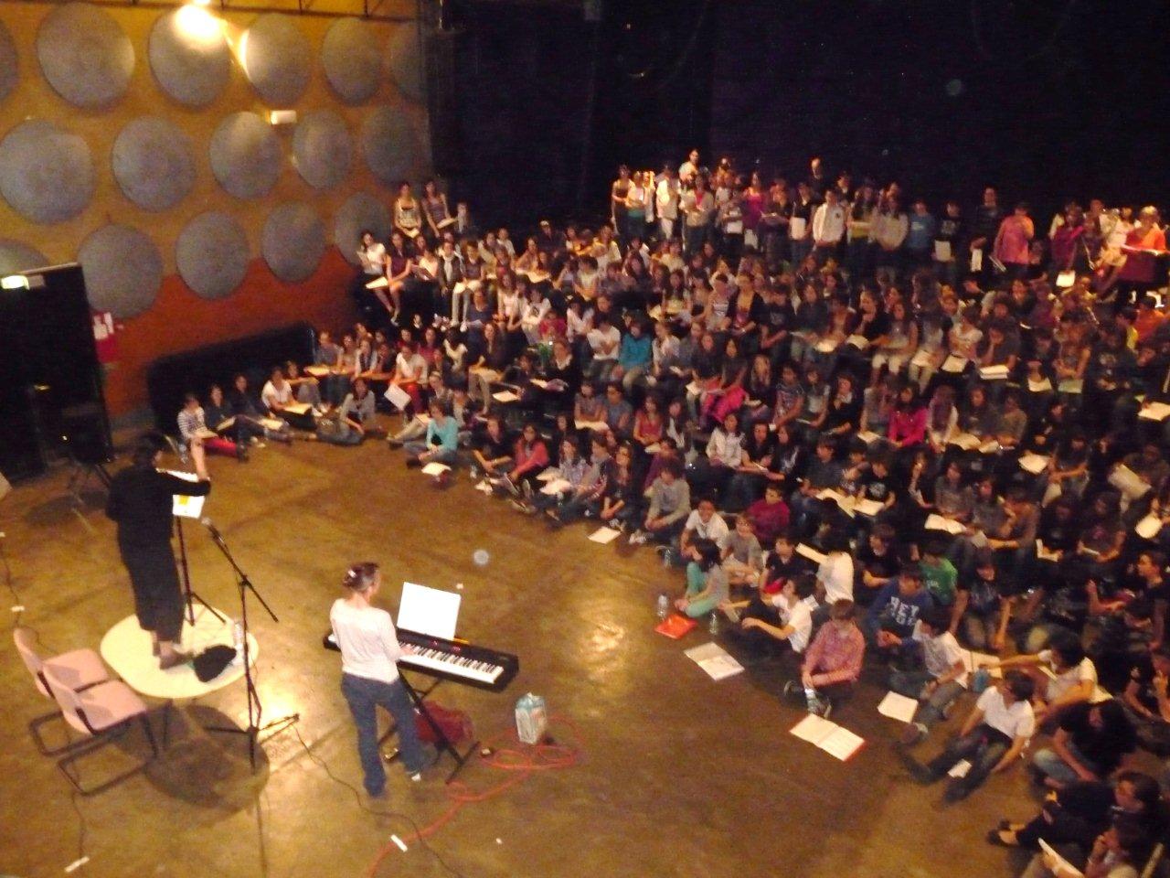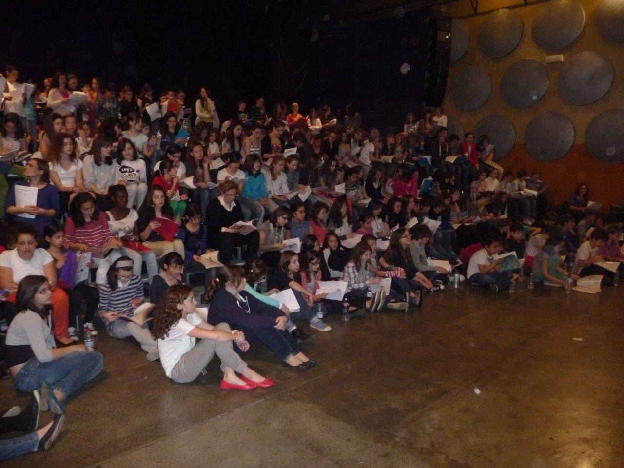 Le mardi 27 Mars, une première répétition commune s'est déroulée dans les anciens locaux de la salle de l'Olympic.Plus de 280 élèves étaient réunis ce jour-là. Ces derniers, habitués pour la plupart à chanter avec une trentaine de leur camarade, allaient prendre conscience de l'envergure du projet : chanter avec 500 collégiens à la cité des congrès, le 1er juin 2012.