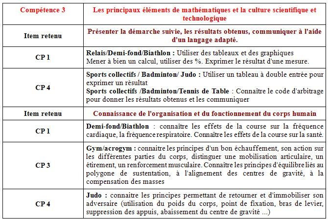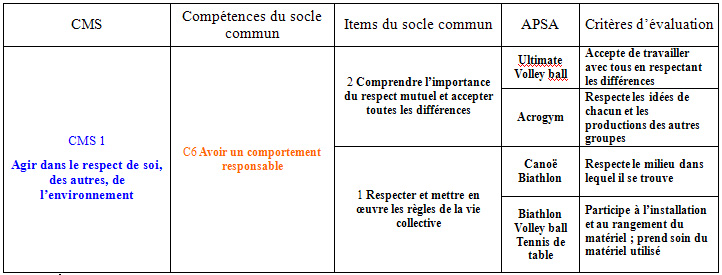 1 - pour chacune des 7 compétences du socle commun, faire le lien entre compétences propres du programme EPS, APSA retenues dans la programmation et items privilégiés.