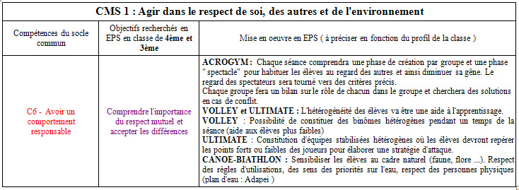 L'équipe des enseignants d'EPS du collège PAUL DOUMER à Nord sur Erdre (44) a cherché à intégrer dans sa réflexion sur le projet pédagogique certains éléments relevant du socle commun. La démarche logique a consisté en plusieurs étapes :