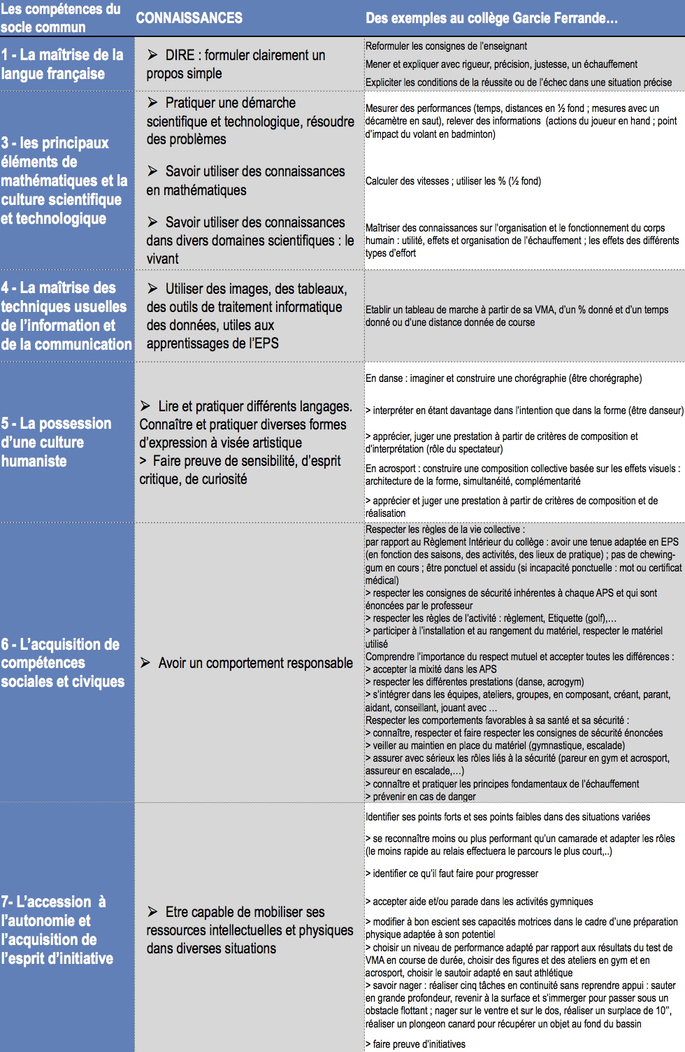 - Dans un premier temps chacune des 7 compétences du socle commun, est déclinée dans la discipline EPS puis précisée en CONNAISSANCES, CAPACITES et ATTITUDES