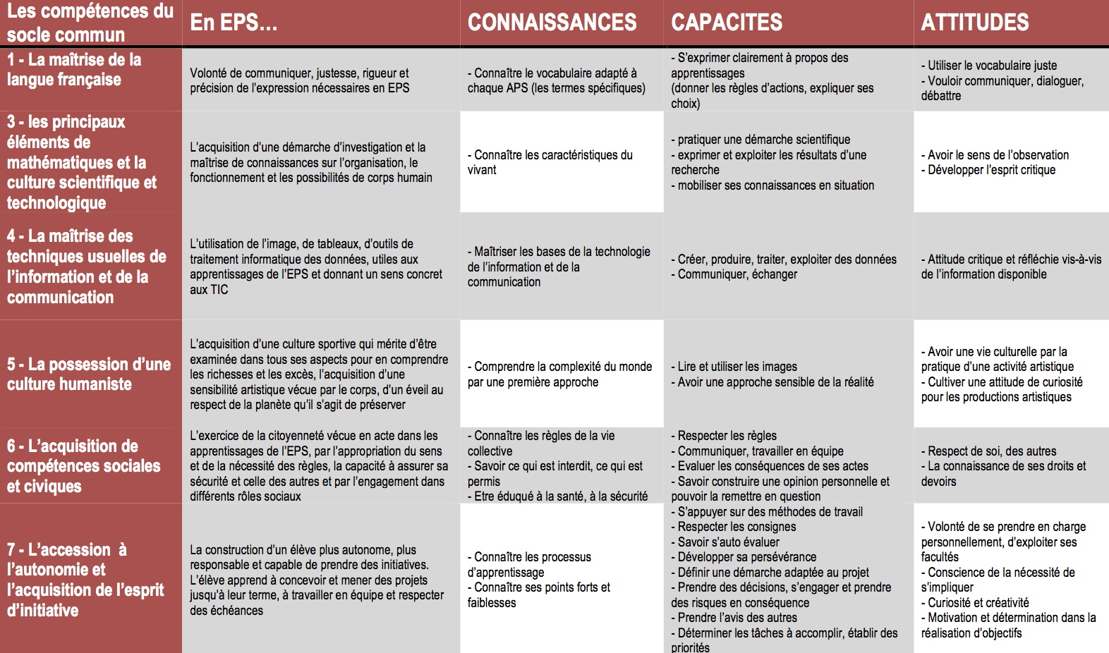 - Dans un second temps chacune des 7 compétences du socle commun, est déclinée dans la discipline EPS puis précisée en CONNAISSANCES, CAPACITES et ATTITUDES