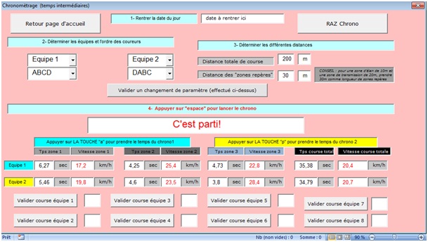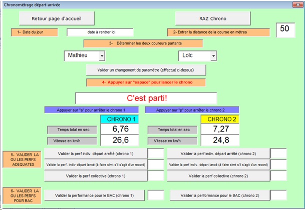 Bien entendu, ce fichier peut et doit être manipulé par les élèves pendant le cours. Les relevés de temps sont parfaitement fiables et s'avèrent à la charge des élèves qui n'ont qu' à presser une touche sur le clavier (le regard de l'observateur est alors porté sur les coureurs alors que le doigt est posé sur la touche du clavier).