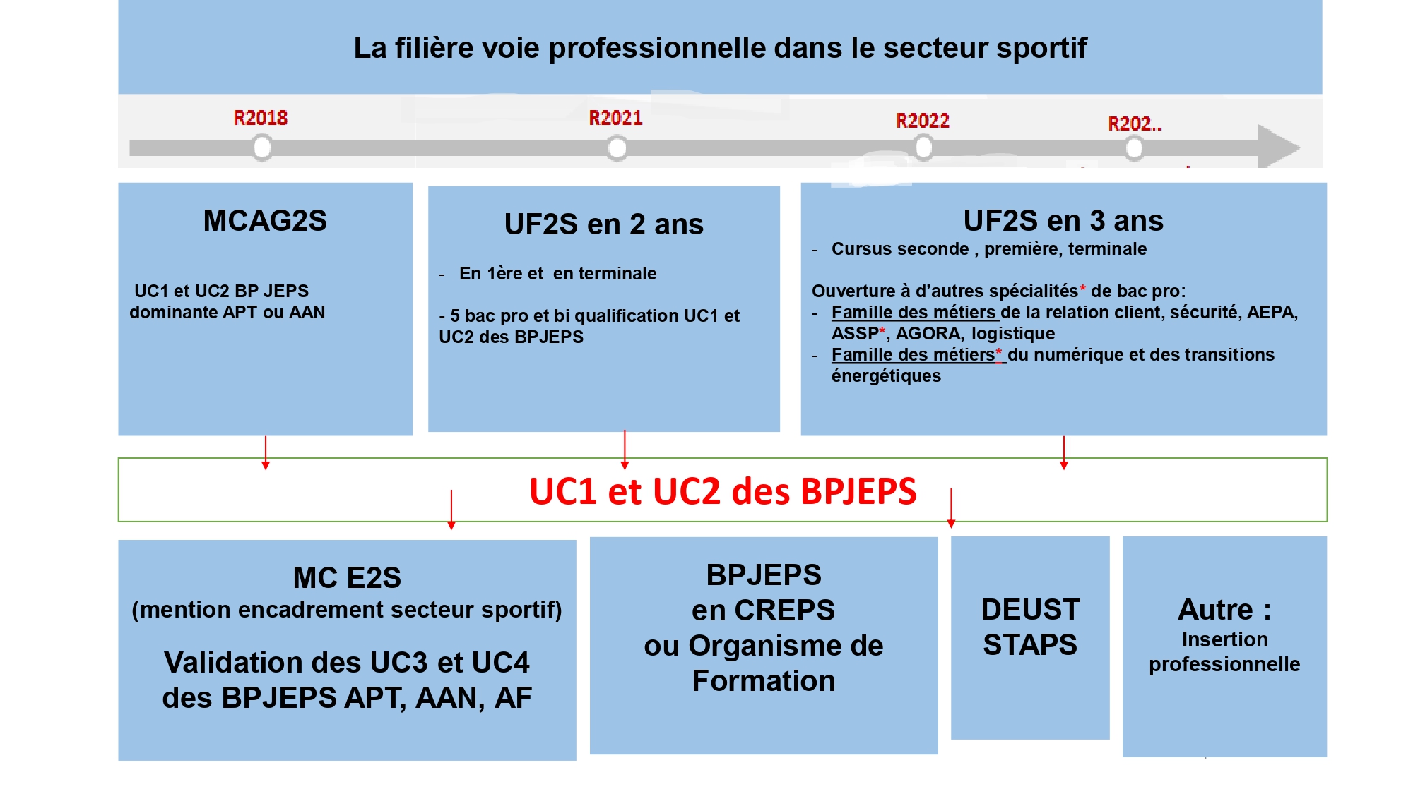 Ouverte à la rentrée 2021, l’UF2S est une unité facultative adossée à 6 spécialités du Baccalauréat professionnel et visant une bi-qualification dans les métiers du sport (équivalence UC1 et UC2 du BPJEPS). Elle s’inscrit à partir de la classe de première dans le parcours de formation qui mène au baccalauréat professionnel.