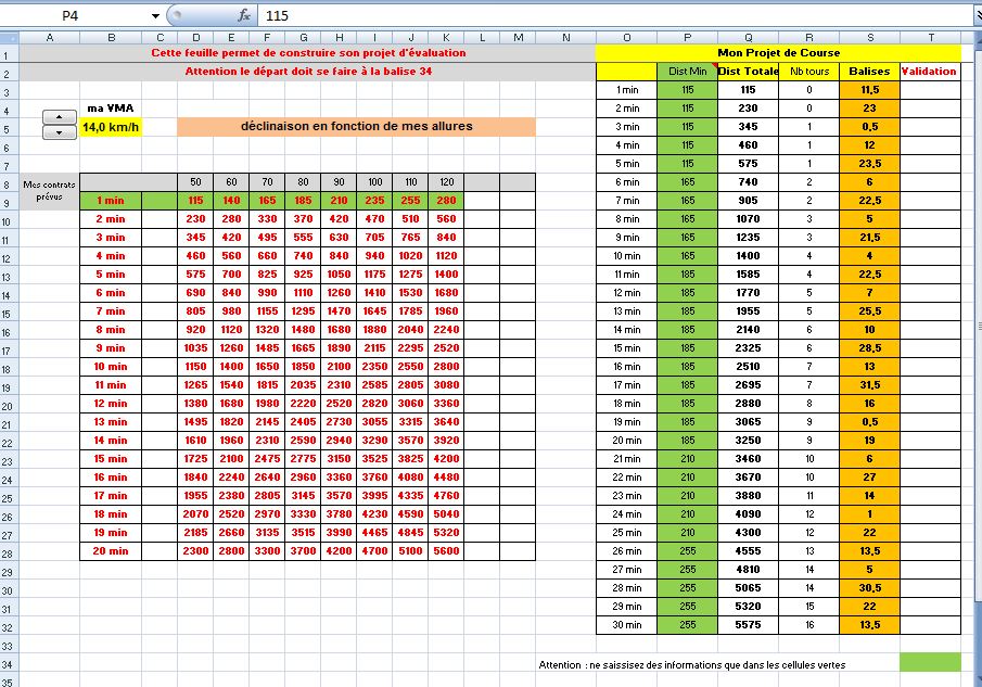 - Le second est un fichier synthèse qui permet à l'enseignant de regrouper sur un même tableau les balises de références de l'ensemble de ces élèves et ce pour chaque minute. Sur la première feuille "allures" vous devez saisir le % de VMA et le nombre de minutes (cellules blanches) le programme calcule la distance totale et la distance à chaque minute. La feuille suivante "repères" étalonne automatiquement la balise de référence pour chaque minute.