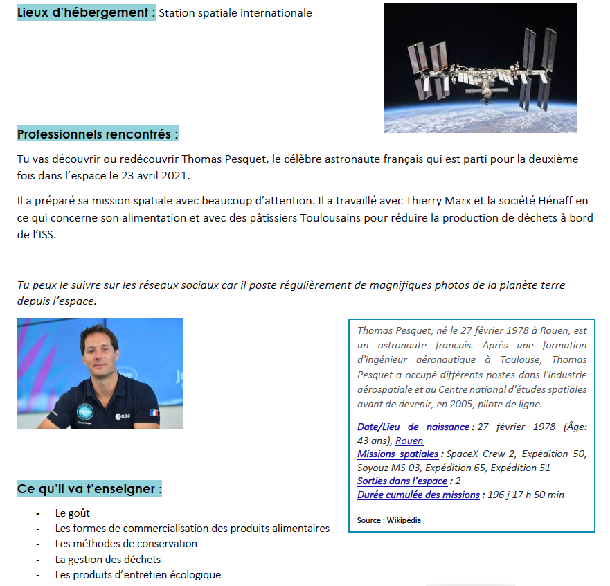 Ce projet pédagogique prend appui sur l'actualité spaciale pour aiguiser la curiosité des élèves. Il porte un regard sur les conditions de vie au sein de l'ISS (International Space Station) et l'alimentation de Thomas PESQUET.