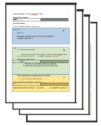 Chaque fois que la condition d’arrêt (case “A”) n’est pas atteinte, on remplit la case “B”. La feuille actuelle est ensuite posée sur la pile des feuilles précédemment posées (contenant en fond de pile le premier appel), puis une nouvelle feuille est prise.