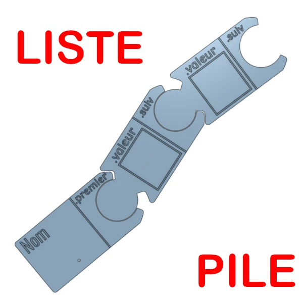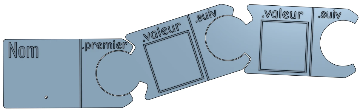 Cette première approche est basée sur des objets à découper en plexiglass qui concrétisent les maillons d’une liste et son premier élément :