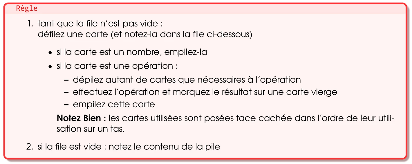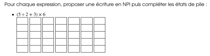 L’activité proposée est basée sur la découverte du calcul post-fixé RPN. Elle se déroule en plusieurs parties. L’activité peut se raccourcir aisément : les parties sont à traiter dans l’ordre mais ne nécessitent pas d’être suivies d’une autre partie. Certains exercices des parties peuvent être proposés en travail supplémentaire ou peuvent ne pas être traités.