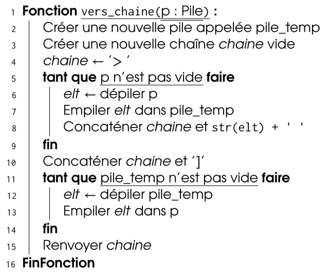 Une classe Pile est créée avec une implémentation à choisir puis l’activité se penche sur la sortie en chaîne de caractères via la méthode spéciale __str__ :
