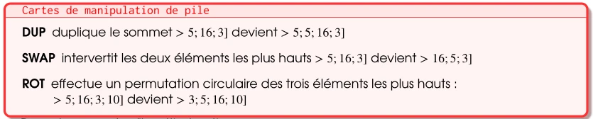 La pile évolue donc avec de nouvelles instructions à gérer, implémentées dans les calculatrices RPN. Ce n’est plus la structure Pile du cours.