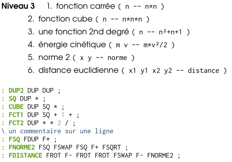 Après une prise en main des calculs basiques, l’activité propose finalement d’écrire de nouvelles fonctions (appelées mots en Forth) :