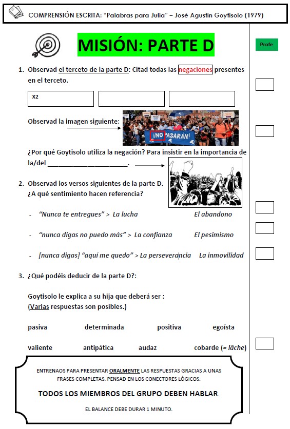 La séance proposée s’appuie sur l’étude du poème "Palabras para Julia" de José Agustín Goytisolo. Les élèves travailleront en groupe, chacun ayant un extrait du poème à analyser. Ils devront ensuite partager leurs réflexions.