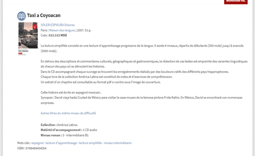 Série de romans du niveau A1 au B1 écrits par Dolores Soler-Espiauba, collection América latina, l'éditeur c'est Difusión et également en France, Editions la Maison des langues (EMDL). Un CD est inclus pour écouter l'histoire lue par des natifs.