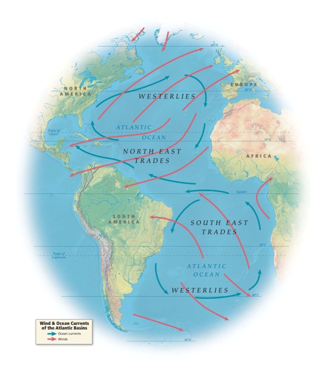 Cette représentation n'évoque pas les contraintes spécifiques de la navigation à voile : la localisation des anticyclones est fondamentale pour comprendre les trajets suivis par les navires. Dans l'Atlantique nord, les vents tournent autour de l'anticyclone des Açores en suivant le sens des aiguilles d'une montre. Les vents sont donc porteurs pour les navires qui quittent l'Europe jusqu'aux îles du cap Vert. Dans l'hémisphère sud, les vents tournent autour de l'anticyclone du Capricorne dans le sens inverse des aiguilles d'une montre : si les vents et les courants sont porteurs entre l'Afrique et l'Amérique, ils ne sont pas très réguliers. Tempêtes et calmes plats se succèdent d'où des temps de parcours très variables. Le voyage retour entre l'Amérique et l'Europe est porté par le courant marin du Gulf Stream et les vents porteurs de l'anticyclone des Açores. En réalité, les parcours maritimes sont évidemment plus complexes que cela : il suffit de suivre les courses océaniques pour prendre conscience des contraintes et des choix souvent différents des skippers modernes.