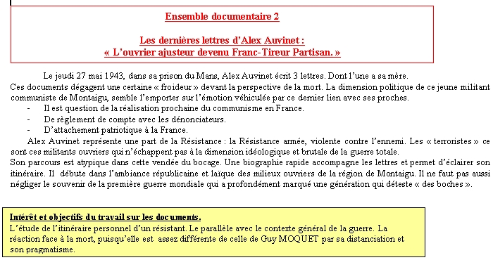 " Conserve cette lettre comme une pièce à conviction...mon cher oncle, tante et cousine, voici la sentence prononcée : treize inculpés, treize condamnés à mort, il ne fallait guère attendre moins. Je crois que nous allons être fusillés demain ou samedi. J'ai fait un paquet avec ma gabardine, mon costume, ma paire de brodequins, mon portefeuille vide, mais j'ai déposé deux mille neuf cent dix francs aux Allemands, qui les feront probablement parvenir. Il y a aussi ma montre. Je te fais adresser tout ça à toi, tu prendras ce qui t'ira, le reste devrait aller au mari d'Odette qui est à peu près de ma taille....Je ne sais pas où l'on va être enterré, mais probablement au Mans ou aux environs ; enfin l'on te préviendra, et si par la suite je peux être amené à Montaigu, cela me fera plaisir ; enterrement sans prêtre évidement. Tu pourras me reconnaître à ma chevalière en acier " inox "que j'ai au petit doigt de la main gauche et à mes dents en acier également...j'ai également déposé trois mille francs chez René Boudazin, qui tient un café sur la route des Sorinières après Ragon...voila pour mes affaires . Maintenant, pour la vengeance qui je l'espère arrivera un jour, voici des noms qu'il ne faudra pas oublier : un nommé Louvreau employé SNCF, né au Mans, James Rogier de Bar-le-Duc, le fameux type qui s'était soi-disant évadé de la prison de Nantes en février, un ancien camarade qui n'était autre q'un policier et qui m'a donné à la police. J'ai été arrêté par la brigade mobile d'Angers par des policiers...tous des salauds, tout ceci tu n'auras qu'à le rapporter en partie après la guerre pour le règlement des comptes. Je mets dans la lettre deux autres lettres, une pour maman, une pour M. et Mme Martin de Montaigu...si après la guerre il y a des œuvres ou des secours pour les parents de francs-tireurs tombés pendant la guerre , tu voudras bien t'en occuper pour maman, tout cela paraîtra dans L'Humanité et tu me rappelleras au parti comme le franc-tireur Auvinet qui a lutté depuis le 13 octobre 1942 au 5 mars 1943, date à laquelle je me suis fait prendre au Mans....vous lutterez vous aussi je l'espère , contre l'esclavage des capitalistes, contre l'exploitation de l'homme par l'homme. Je vous embrasse tous... "