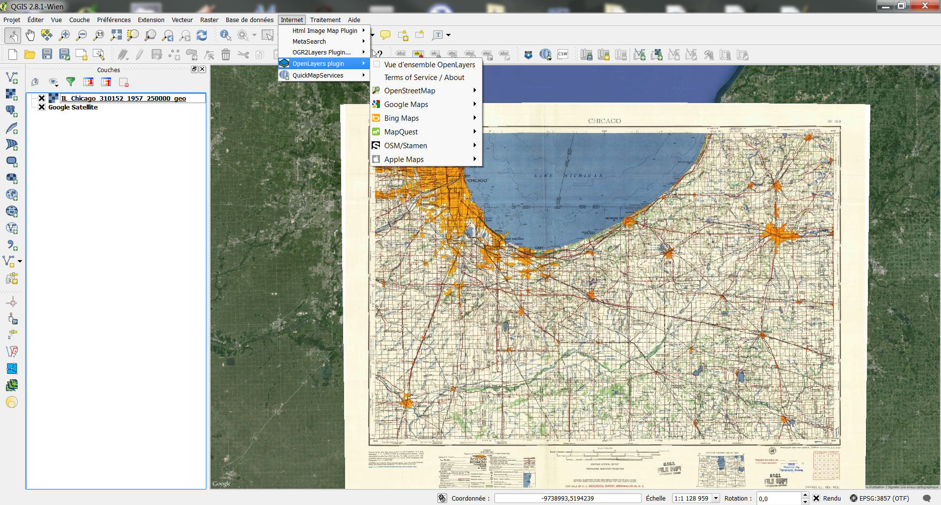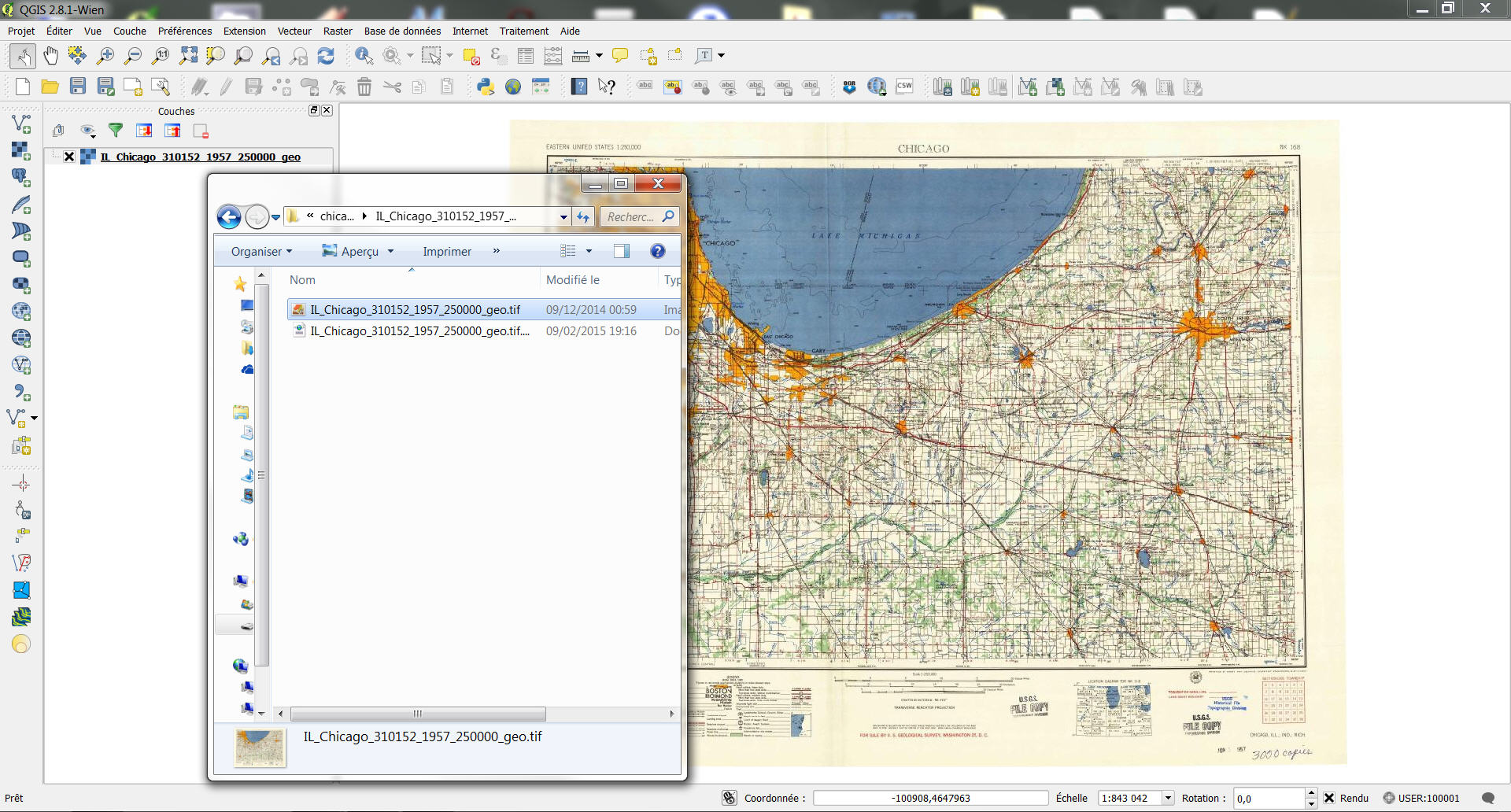 Après avoir téléchargé le format geotiff, affichons la carte ancienne de Chicago dans qgis. Le système de projection doit être en wgs84 de préférence.