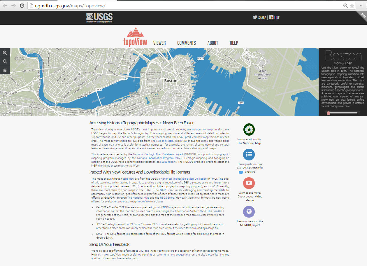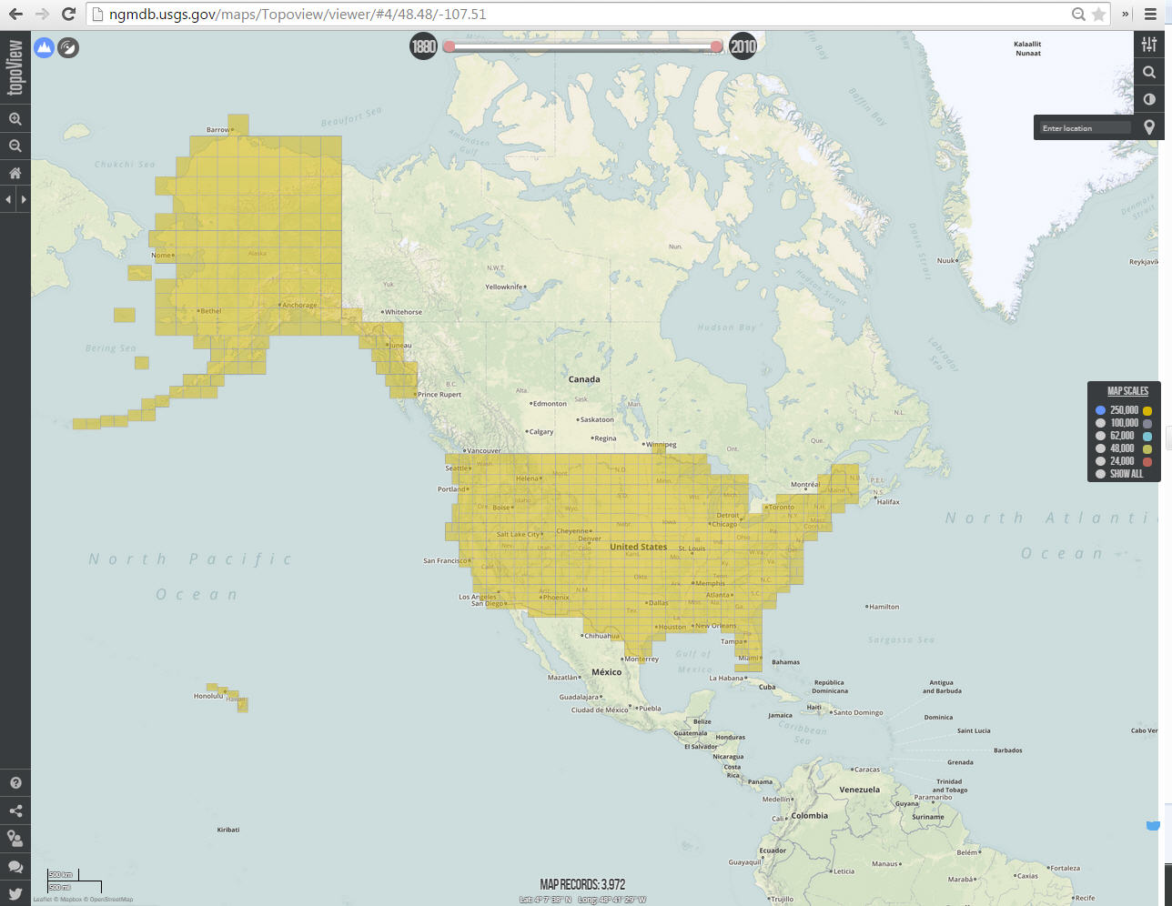 Le portail de l’USGS (United States Geological Survey) offre désormais l’accès à des cartes historiques sur l’ensemble du territoire américain à différentes échelles et étendues spatiales. Les plus anciennes datent de 1882.