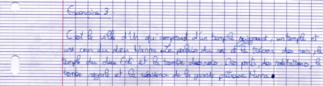 Dans cet exercice il fallait décrire la ville d’Ur en indiquant les fonctions des éléments qui composent la ville. Tu as bien compris la consigne mais ta description de la ville est trop brève. Réécris ton travail en accentuant la description (quels sont les différents bâtiments qui composent la ville ?) et en évoquant à chaque fois la fonction des éléments.