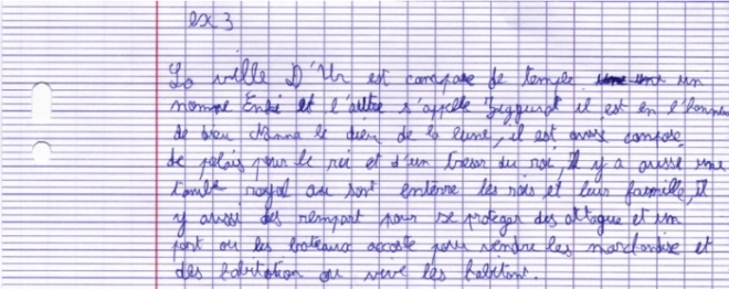 Ensuite, des activités sont proposées aux élèves selon les erreurs repérées au préalable. Ainsi, une majorité d’élèves de 6ème ayant décrit la ville d’Ur ont omis d’évoquer les fonctions des différents éléments qui composent la cité. Lors de la correction de l’activité, on attire leur attention sur ce manque et ils sont invités à un travail de réécriture visant à retravailler spécifiquement cette capacité de description.