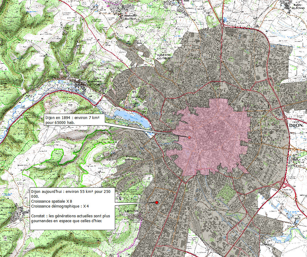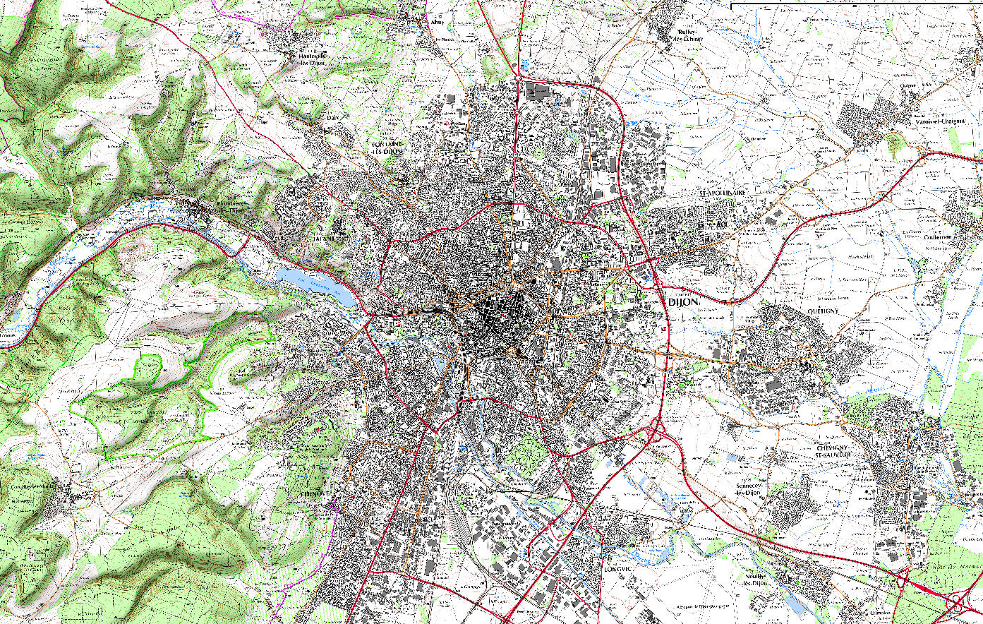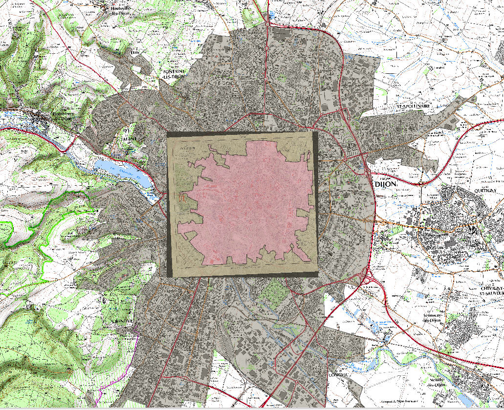 Superposition d'un document ancien, le plan Bonnamas de 1895, disponible sur le site internet des archives de Dijon, sur la carte topographique de l'IGN.