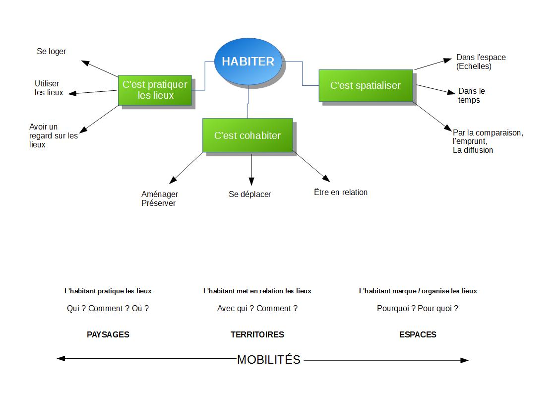 - un schéma de lecture du concept « habiter » sous ses trois aspects majeurs (Pratiquer / Cohabiter / Spatialiser) télécharger le schéma