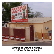 Les capitaux sont français à l'origine, aujourd'hui franco-sénégalais, la société produisait 100% des besoins du Sénégal il y a quelques années, mais les conditions politiques ont changé et aujourd'hui la concurrence est très forte. En effet, une usine est installée à Dakar qui ne fait que de la mise en boîte. De plus les importations chinoises sont de plus en plus fortes. Loin de Dakar, le principal marché du pays, la société semble devoir se battre à armes inégales, elle le fait en augmentant sa productivité. Elle produit encore de 75 à 80 % du marché mais l'inquiétude grandit alors que de nouveaux concurrents se présentent. De plus les prix baissent , les salaires n'ont pas été augmentés.