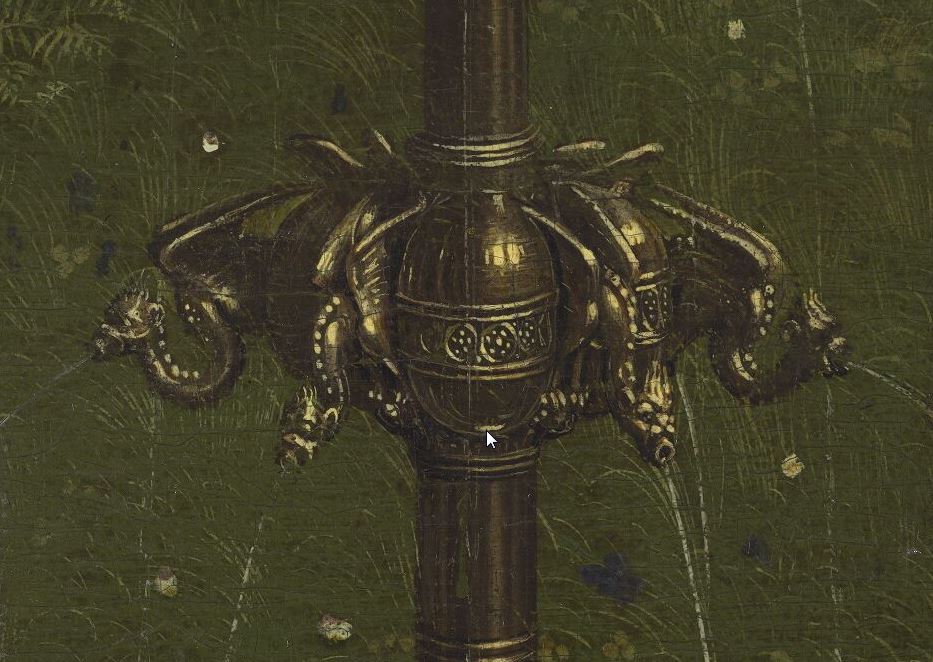 On repère dans les becs en forme de dragons de la fontaine de Vie le reflet des fenêtres de la chapelle de l'Annonciation. Le jet d'eau est parfaitement représenté par des fines lignes blanches irrégulières.