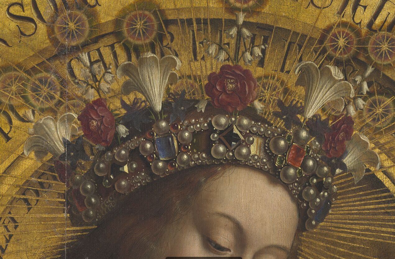 La qualité de l'image permet d'identifier les fleurs qui ornent la couronne de Marie : le lys, symbole de pureté, le muguet (humilité), les ancolies ( soumission), les roses sauvages(amour).