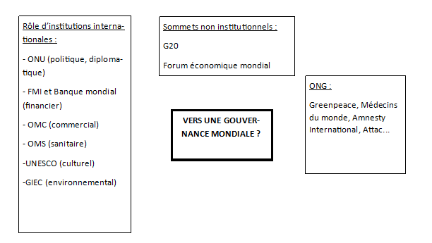 La mondialisation est un processus continu d'intensification et de fluidification des échanges qui entraine et accentue les phénomènes de diffusion et d’homogénéisation, qui met en concurrence les territoires et alimente des mouvements de contestations. La mondialisation fait intervenir des acteurs variés et pose la question d’une gouvernance mondiale.